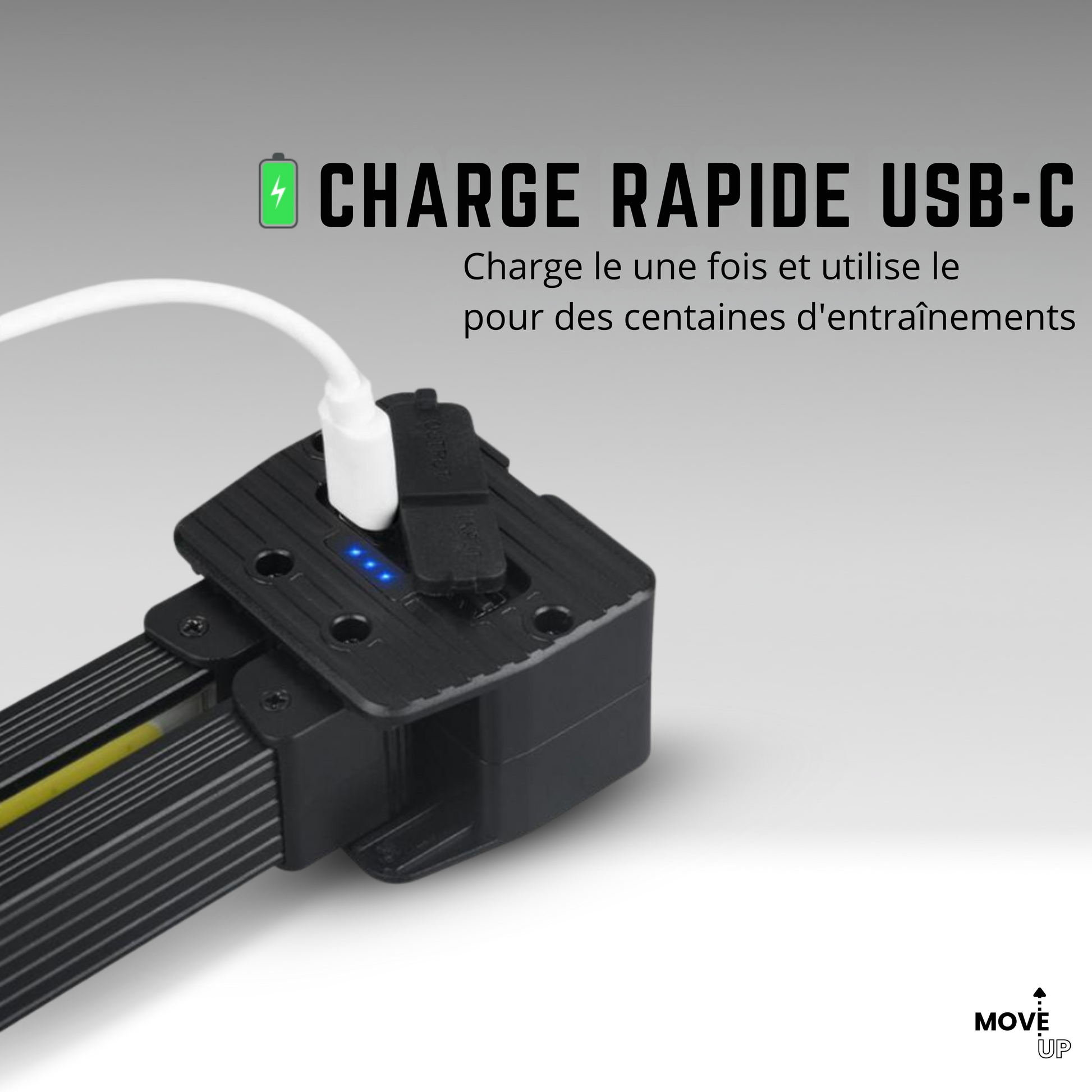 La batterie du GymBro offre jusqu’à 6 heures d’autonomie avec une seule charge, selon l’intensité lumineuse et le mode choisi.